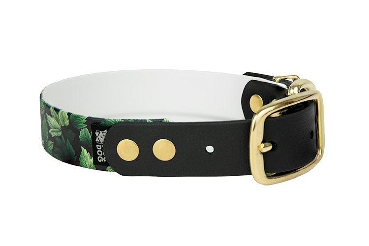 Obroża dla średnich i dużych psów.  Główną część obroży tworzy wodoodporna taśma Biothane z nadrukiem Liście. Obroża jest dostępna w dwóch szerokościach 19 mm i 25 mm.