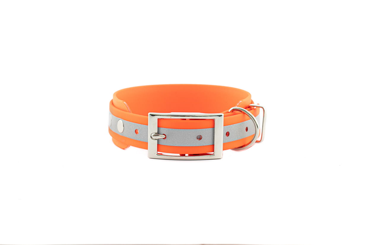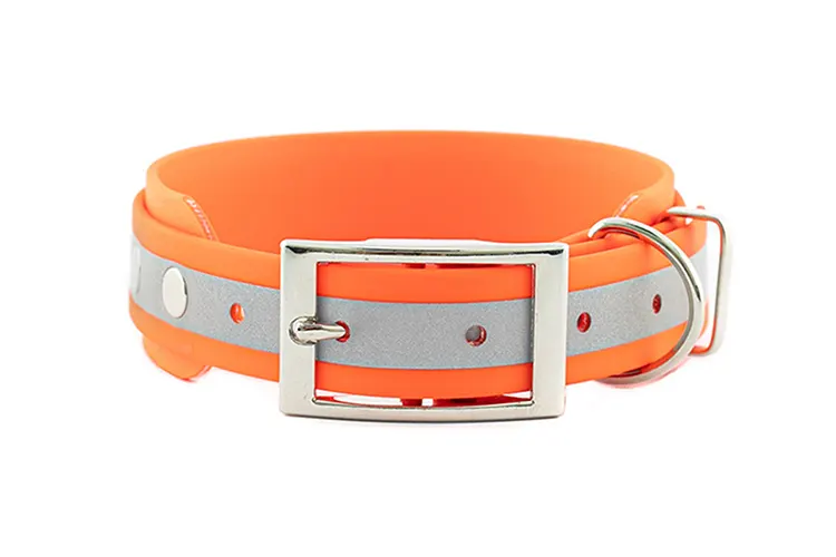 Materiał z którego zrobiona jest obroża to BioThane®, produkowany i opatentowany w Stanach Zjednoczonych. Materiał został poddany wielu testom wytrzymałościowym i jakościowym. BioThane® jest miękki i elastyczny, doskonale imituje skórę naturalną, grubość materiału to 2,5mm.