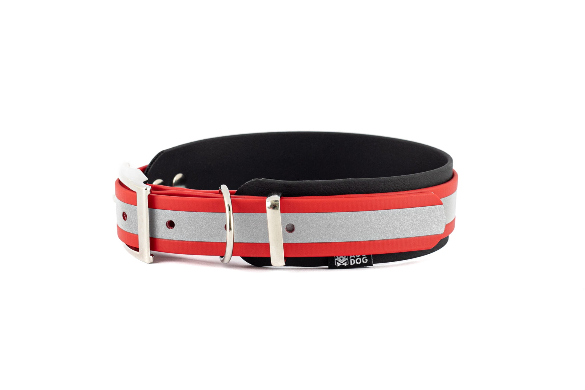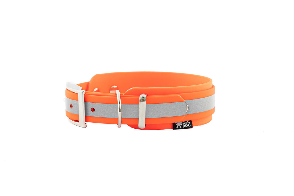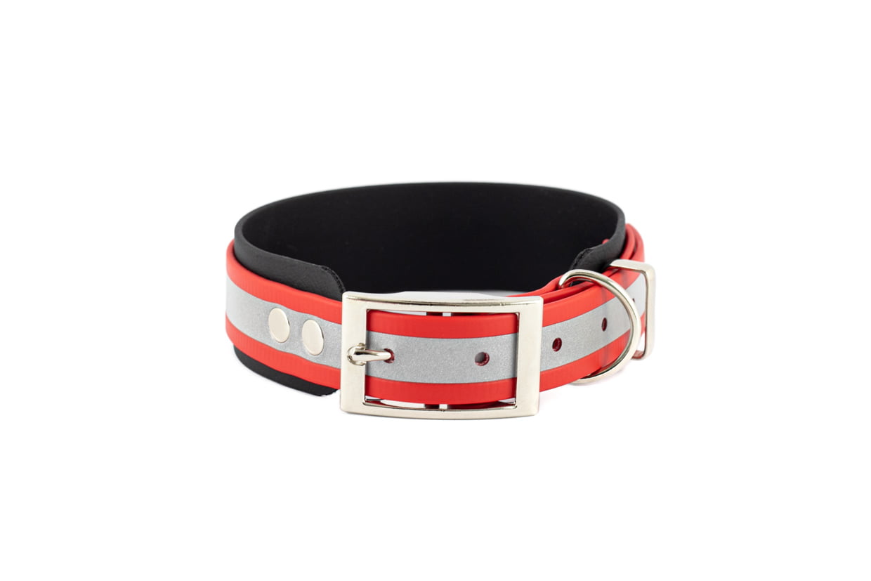 Obroża powstała z myślą o bezpieczeństwie psów w ciemności. Na całej długości zastosowaliśmy BioThane Reflective, który doskonale odbija światło w ciemności. Podparcie dla kręgów szyjnych stanowi druga warstwa taśmy o szerokości 38mm. Obroża doskonale sprawdzi się dla dużych i średnich psów oraz chartów. Zapięcie (taśma odblaskowa) możemy zrobić z taśmy o szerokości 25 mm lub 19 mm.
