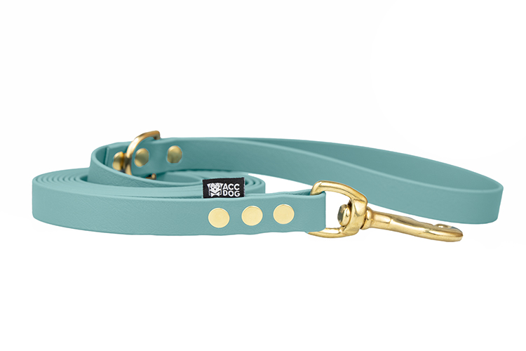 Smycz miejska w kolorze turkuskowym powstała z BioThane®. Jest to materiał opatentowany, produkowany w Stanach Zjednoczonych. Doskonale imituje skórę naturalną, a przy tym odznacza się niesamowitymi wręcz parametrami wytrzymałościowymi.