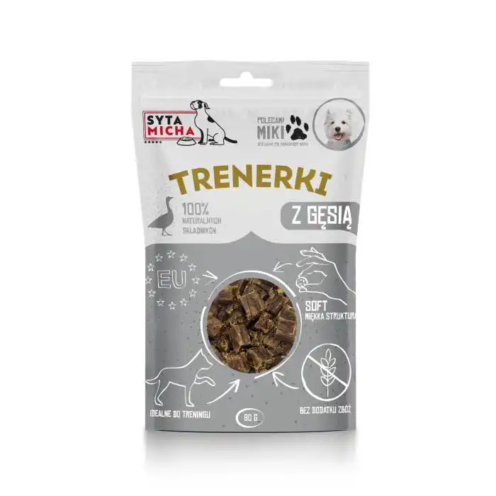 Smaczki z gęsią od Sytej Michy to małe, miękkie kawałeczki zamknięte w szczelnym opakowaniu, dzięki czemu nawet po otwarciu zachowują swoją świeżość i konsystencję.